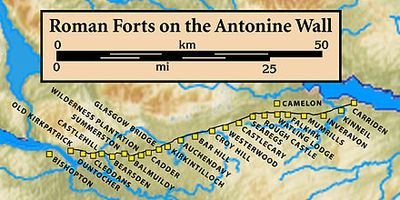 Around 142 AD the Romans built a row of forts across Scotland, nowadays known as "The Antonine Wall". It was designed as a barrier between Roman civilization (south of the wall) and wilder territory to the north that the Romas had failed to conquer. For a short period, it replaced the more southerly "Hadrian's Wall". About a third of the way along the wall (from the west) was a fort known as Caerpentaloch "the fort at the head of the ridge," from the Brythonic word caer (fort); and the Scottish Gaelic words cinn (at the head of) and tulaich (hill). This name later transmogrified into “Kirkintilloch”.